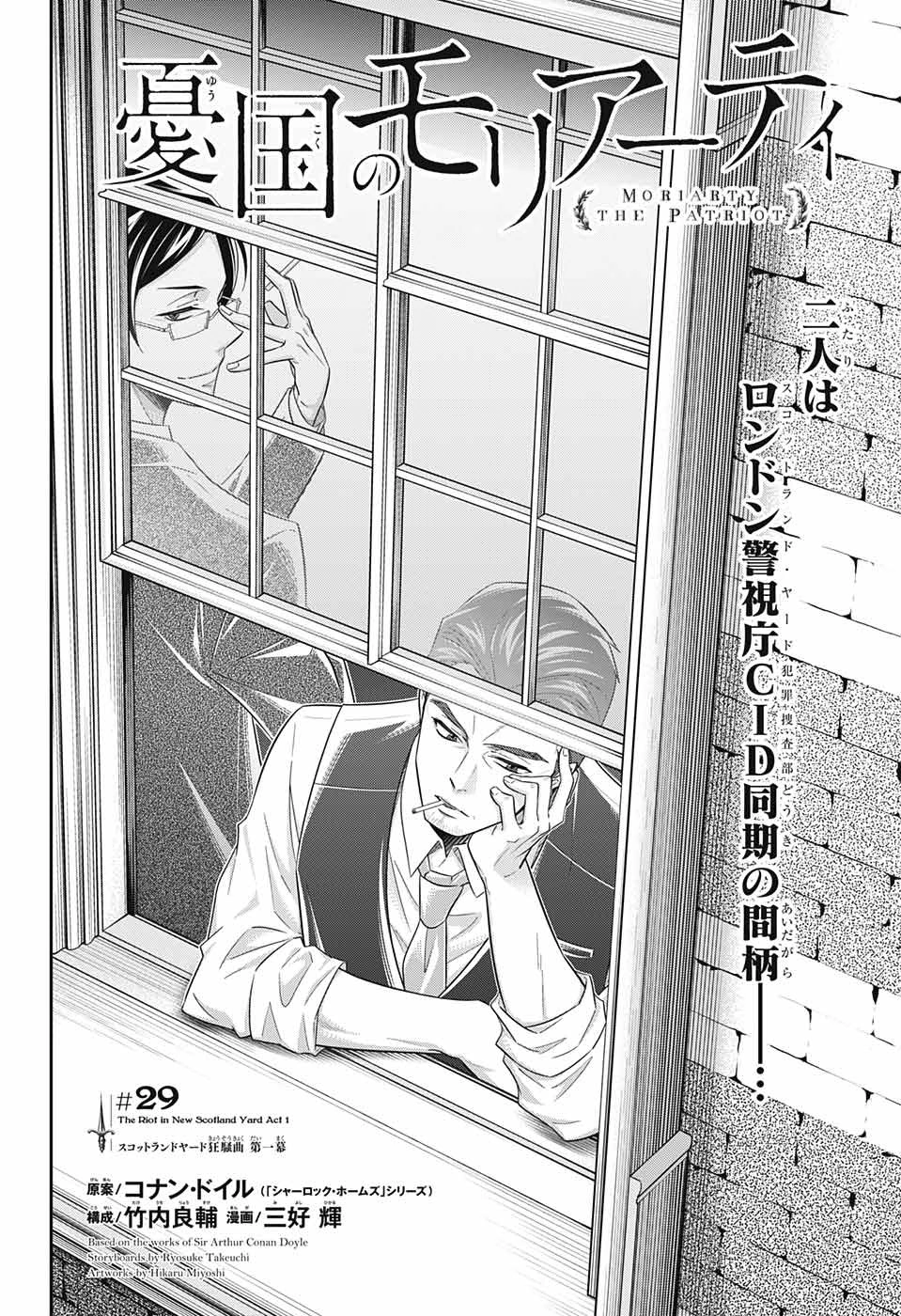 The Riot in New Scotland Yard Act 1 (The Riot in New Scotland Yard Act 1 スコットランドヤード狂騒曲 第一幕, The Riot in New Scotland Yard Act 1 Sukottorando Yādo Kyōsō Kyoku Dai Ichi Maku) is the twenty-nineth chapter of the MORIARTY THE PATRIOT manga series.
