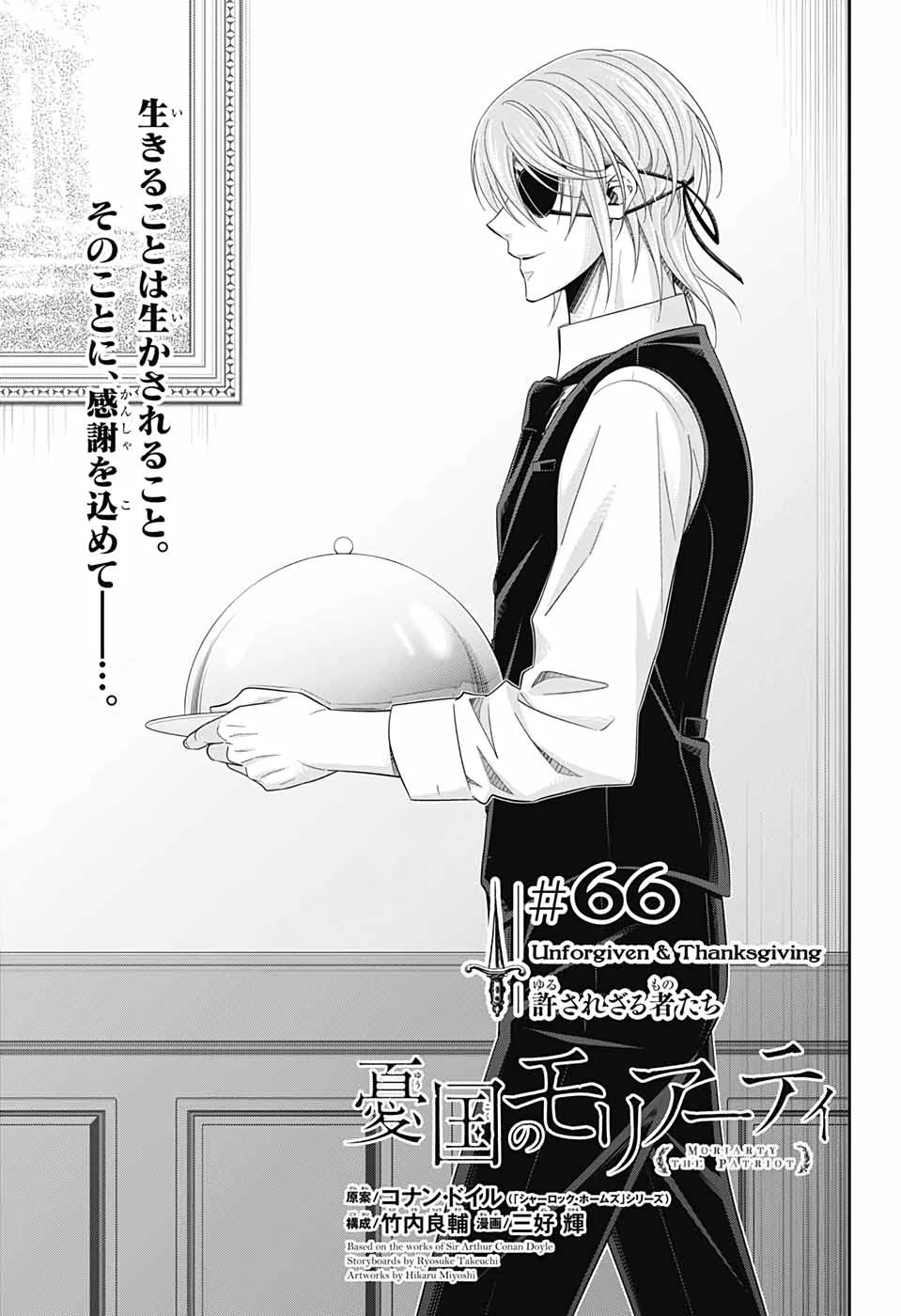 Unforgiven & Thanksgiving (Unforgiven & Thanksgiving 赦されさる者たち Unforgiven & Thanksgiving Yurusaresaru Monotachi) is the sixty-sixth chapter of the MORIARTY THE PATRIOT manga series.